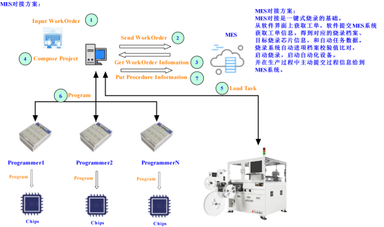 作为工厂内部生成的一个环节,同时为了保证汽车电子生产过程中的全程可追溯性,昂科技术提供的芯片烧录方案全面支持与客户MES系统的对接。如上图所示,客户可以自行开发或使用昂科技术提供的标准MES对接软件进行MES对接与自动化设备的。